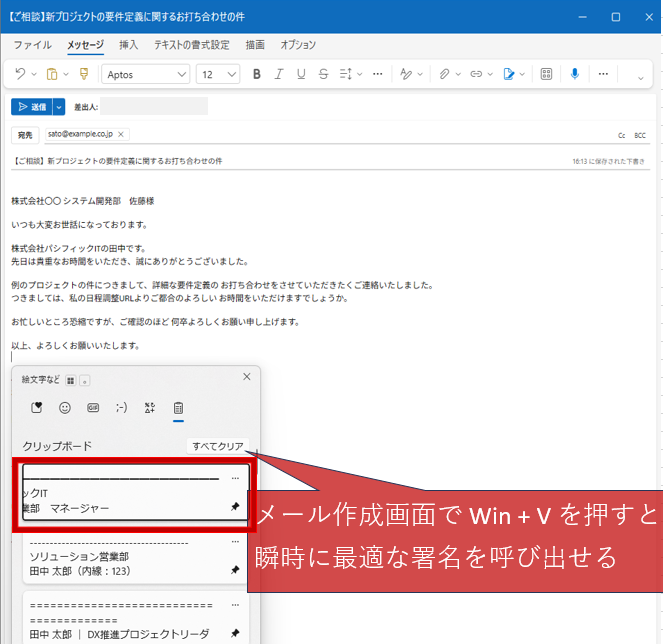 この設定をしておくだけで、メール作成画面で Win + V を押すだけで、いつでも・どのメーラーでも、瞬時に最適な署名を呼び出せるようになります。