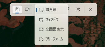 Windowsロゴキー+Shift+Sを同時に押す。- 画面が暗くなったら、上部のアイコンでモード(四角形・自由形式・ウィンドウ・全画面)を選ぶ。