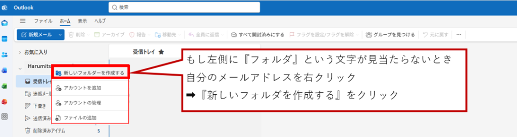 左側に『フォルダ』という文字が見当たらないときの例:自分のメールアドレスを右クリック➡『新しいフォルダを作成する』をクリック