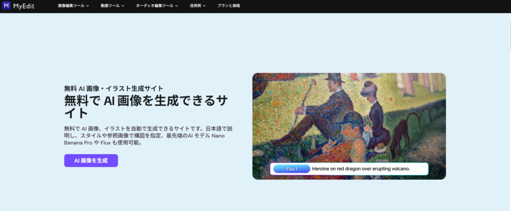 • アカウント登録の手間を省いて、今すぐ試したいなら4位:MyEdit。ブラウザを開いて数秒でAI生成の凄さを体感できます。