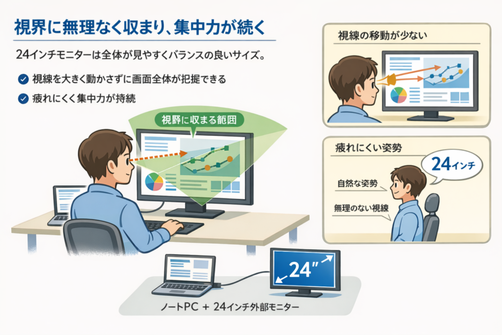 人間が一度に集中して捉えられる視界には限りがあります。24インチは、デスクに座った際に視線を大きく動かさなくても画面全体を把握できる、人間工学的に非常にバランスの良いサイズです。情報が視界にしっかり収まるため、疲れにくく、集中力も長時間持続します。