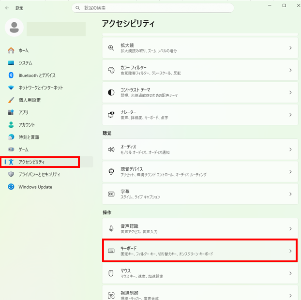 - 左メニューの「アクセシビリティ」を選択し、操作セクションにある「キーボード」をクリック