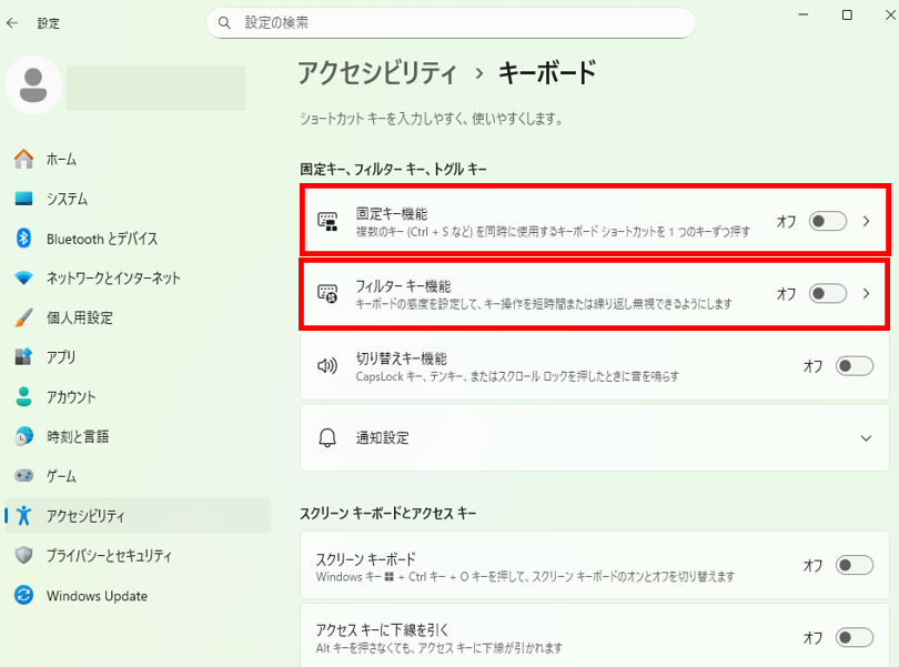 - **「固定キー機能」および「フィルタキー機能」**が「オフ」になっているか確認