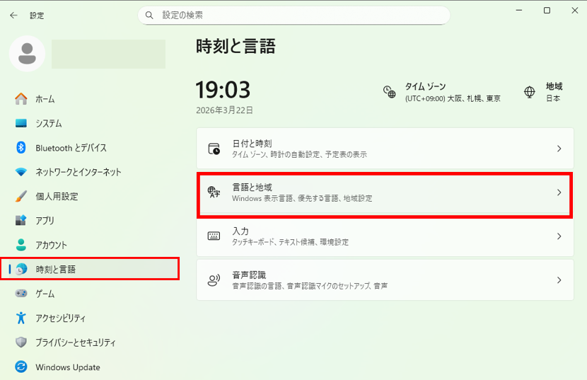 - 「設定」>「時刻と言語」>「言語と地域」を開く