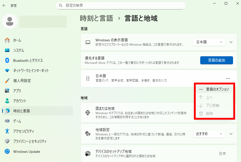 - 日本語の右側にある「…」から「言語のオプション」を選択