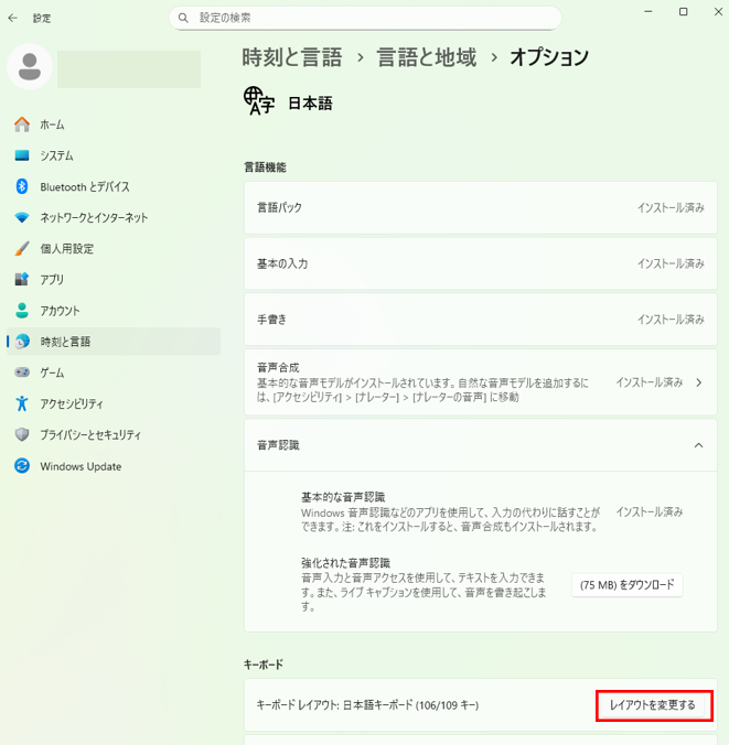 - 「キーボードレイアウト」の項目で「レイアウトを変更する」をクリック