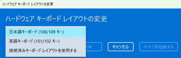 - **「日本語キーボード(106/109キー)」**が選択されているか確認し、違えば変更して再起動する