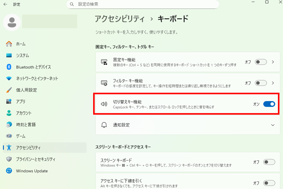 キーを押した瞬間に「ピッ」と音が鳴るように設定しておけば、入力ミスにその場で気づけるようになります。Windows 11での設定手順は以下の通りです。