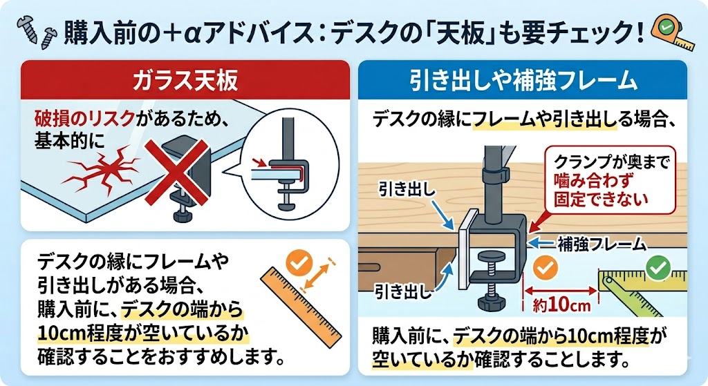 - 引き出しや補強フレーム: デスクの縁に引き出しやフレームがある場合、クランプが奥まで噛み合わず固定できないことがあります。購入前に、デスクの端から10cm程度が空いているか確認することをおすすめします。
