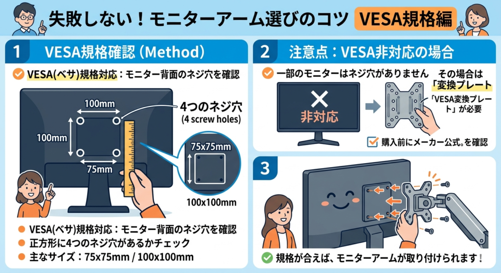 - 注意点: 多くのモニターが対応していますが、中にはVESA非対応のモデルもあります。その場合は「VESA変換プレート」という別売りのアダプターが必要になるため、購入前に必ずメーカーの公式サイトで仕様を確認しましょう。