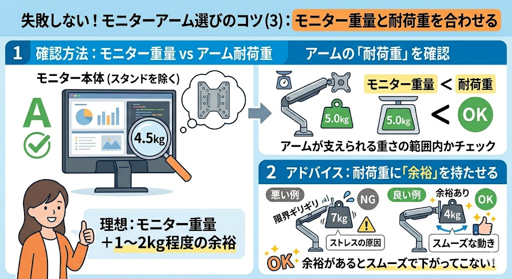 - アドバイス: ギリギリの重さではなく、耐荷重に余裕があるものを選んでください。限界に近い重さだと、アームが少しずつ下がってきたり、アームの動きが硬くなったりしてストレスの原因になります。モニターの重量+1〜2kg程度の余裕を見るのが理想です。