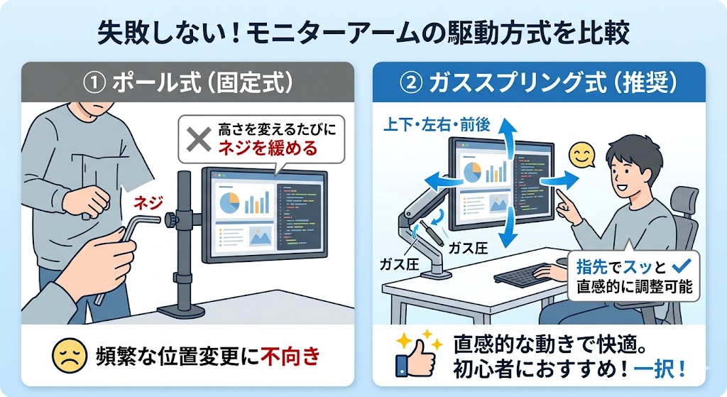 モニターアームの動きを決める駆動方式には、大きく分けて「ポール式」と「ガススプリング式」があります。