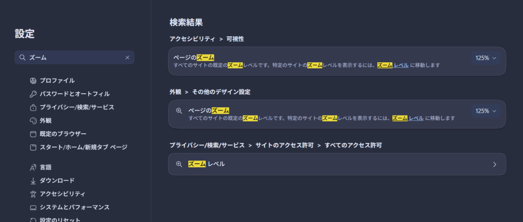 設定画面にいくつか『ページのズーム』が出てきますが、どれか一つを変えればOKです。例えば、一番上の 『アクセシビリティ > 可視性』 にある数値を変更してみましょう。