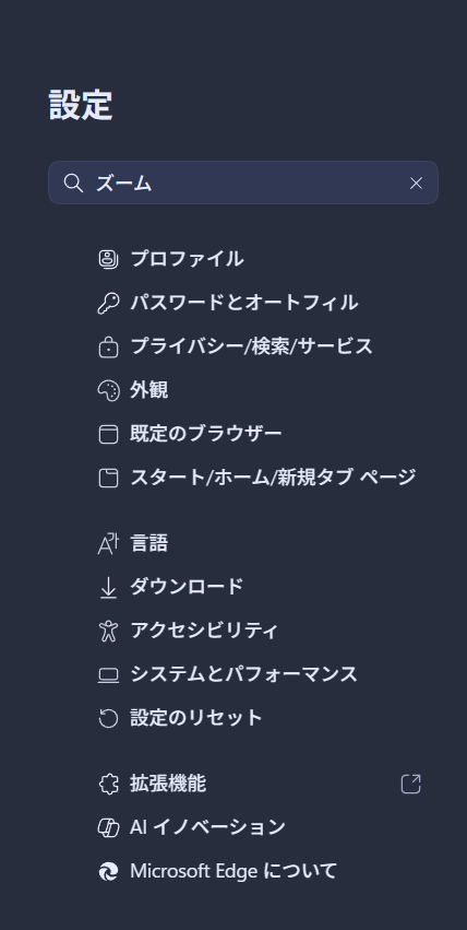 3.左側のメニュー一覧から 「設定の検索」(虫眼鏡の窓)に 『ズーム』 と入力する