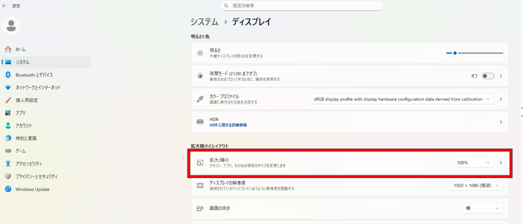 - 解決策: Windowsの「ディスプレイ設定」で、解像度が**「(推奨)」**になっているか確認しましょう。その上で、滲みが気になるなら拡大率を一段階下げ、代わりに後述する「物理的な距離」で調整するのがコツです。